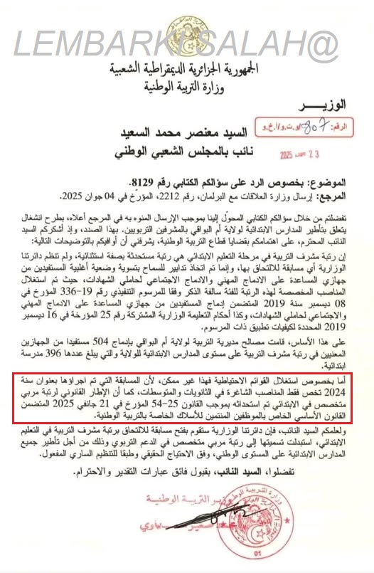 وفي رد وزير التربية حل سد الشغور الكائن ببعض المؤسسات التربوية في الطور الابتدائي برتية مربي دعم تربوي كان رده صريح وعبر فيه وزيرة التربية على امكانية فتح مسابقة في قطاع التربية في رتبة مشرف تربية ابتدائي ( مربي دعم  تربوي” ) في الأيام القادمة دون التطرق الى التخصصات وعدد المناصب وبذلك اكد وزير التربية ان مسابقة مربي دعم تربوي في قطاع التربية سوف تكون خلال السنة الحالية 2025 او السنة المالية القادمة  2026 دون الإفصاح على التفاصيل الكاملة المتعلقة بمسابقة مربي دعم تربوي ( مشرف تربية ابتدائي )