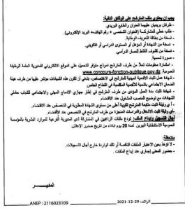 - تودع الملفات لدى المديرية الفرعية للموارد البشرية بالمؤسسة الاستشفائية البيرين الجلفة في أجل أقصاه 20 من تاريخ النشر 29ديسمبر 2021