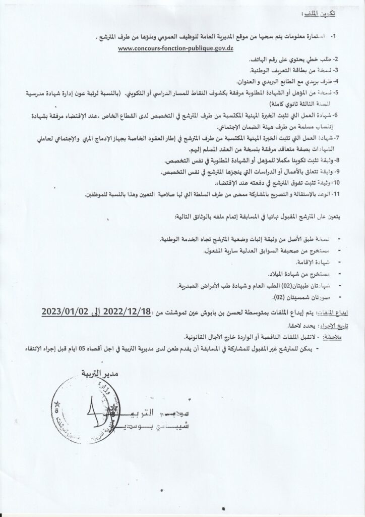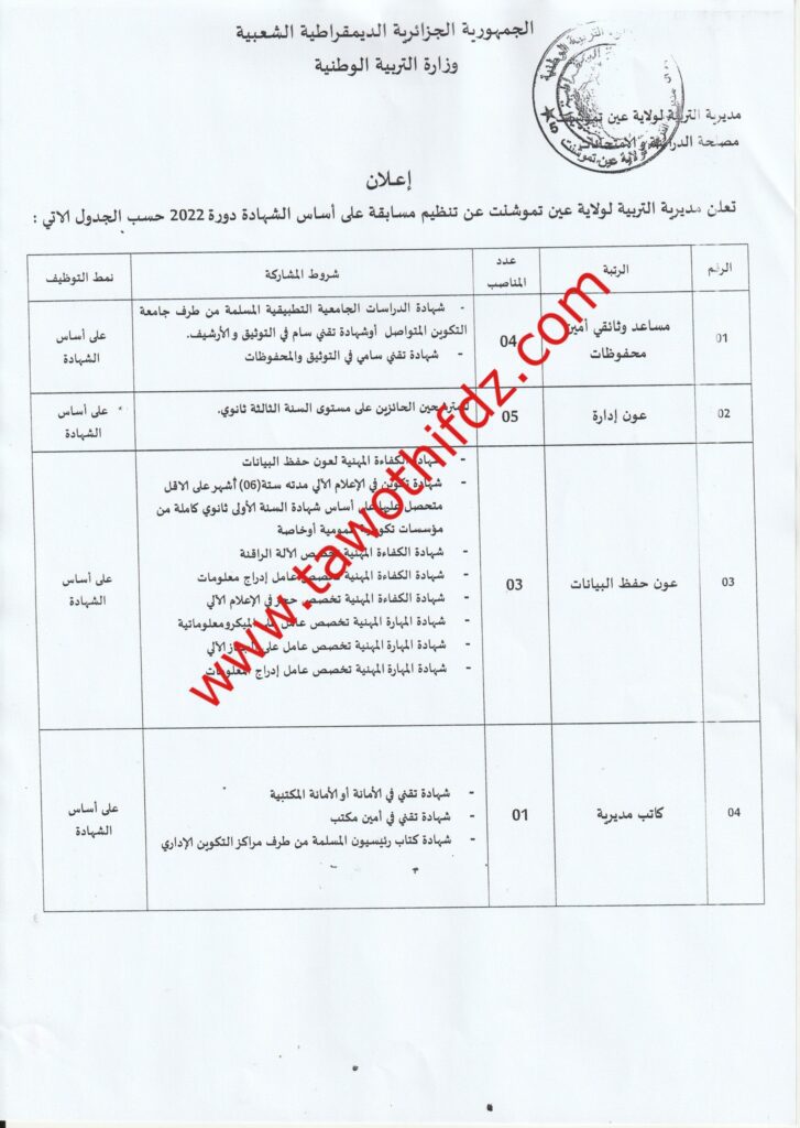 تعلن مديرية التربية لولاية عين تيموشنت عن فتح مسابقة على أساس الشهادة للتوظيف في الرتب المبينة أدناه: