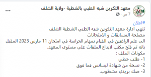يرجى بعد دفع الملف البقاء على تواصل مع المعهد فقد يتم ارسال استدعاء المعنين بالحراسة في الشبه الطبي او التواصل معهم عبر ارقام الهواتف الصورة لمعهد الشبه الطبي الشطية ولاية الشلف لذلك لمن يهمه الامر يحاول الاطلاع على اعلانات معاهد الشبه الطبي لولايتك والتواصل معهم .